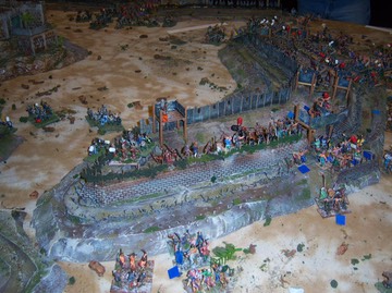 In addition to the defenses the Romans had catapults placed at regular intervals to fire from behind or along the ramparts. The Romans had range markers to know when to start shooting.