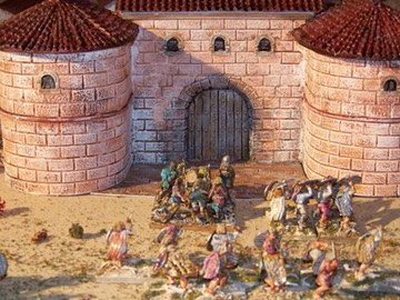 Above is a typical method of assault on gates. The enemy attackers hope to push a wagon against the gate and then set it on fire to burn the gates. Notice the unit on the right who have formed a shield wall. The men would hold their shields over their heads to protect themselves from Roman fire coming down from the walls and towers by the defenders.