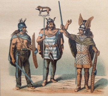 The soldier on the left is very realistic. The central fgure is a standard bearer. The soldier to the right is a chief or tribal unit leader. The Gauls used colorful garments and large oval shield much like those of the Romans.